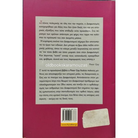 *Το έργο αποτελεί θεμελιώδη μελέτη για την κατανόηση των ιδεών που διαμόρφωσαν τον σύγχρονο δυτικό κόσμο. Σ' αυτό το προκλητικό βιβλίο ο Peter Gay διαλύει παλιούς μύθους και αποσαφηνίζει τον ιστορικό ρόλο, τις διαχρονικές αξίες και το πνεύμα του Διαφωτισμού. Αντιτάσσεται στον μεταμοντέρνο λόγο που θεωρεί τον Διαφωτισμό πρόδρομο των ολοκληρωτισμών του 20ού αιώνα, και τονίζει ότι ο ορθολογισμός των ανθρώπων του Διαφωτισμού δεν σημαίνει την αφελή εμπιστοσύνη στην παντοδυναμία του ορθού λόγου, αλλά την πίστη στο κριτικό πνεύμα, που θέτει όλες τις απόψεις υπό αίρεση - ακόμη και τις δικές τους. "Στόχος πολεμικής σε όλη του την πορεία, ο Διαφωτισμός κατηγορήθηκε για ιδέες που δεν ήταν δικές του και για ιστορικές εξελίξεις που ούτε επιδίωξε ούτε προκάλεσε. Στο πέρασμα των χρόνων απέκτησε μια φήμη που τώρα πια καλύπτει το πρόσωπό του σαν άκαμπτη μάσκα. Η κυρίαρχη εικόνα του Διαφωτισμού σήμερα δεν αποτυπώνει το έργο των ειδικών. Δεν μπορώ να βρω άλλο πεδίο ιστορικής μελέτης, όπου το χάσμα μεταξύ λογιοσύνης και κοινού να είναι τόσο βαθύ και τόσο μοιραίο όσο στον Διαφωτισμό. Και λέγοντας "κοινό" εννοώ τους καταναλωτές εγχειριδίων και, φοβάμαι, συχνά και τους παραγωγούς τους επίσης".