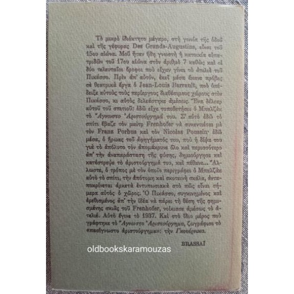 *ΤΟ ΜΙΚΡΟ ΙΔΙΟΚΤΗΤΟ ΜΕΓΑΡΟ, στη γωνία της οδού και της γέφυρας Des Grands-Augustins, είναι του 15ου αιώνα. Μου ήταν ήδη γνωστή η κατοικία ευπατριδών του 17ου αιώνα, στον αριθμό 7, καθώς και οι δύο τελευταίοι όροφοι που είχαν γίνει το ατελιέ του ΠΙΚΑΣΣΟ. Πριν απ' αυτόν, εκεί μέσα έκανε πρόβες σε θεατρικά έργα ο Jean-Louis Barrault, που υπέδειξε αυτούς τους περίεργους διαθέσιμους χώρους στον Πικάσσο, κι αυτός δελεάστηκε αμέσως. Ένα δέλεαρ αυτού του σπιτιού: εδώ είχε τοποθετήσει ο Μπαλζάκ το "Άγνωστο Αριστούργημά του". Σ' αυτό εδώ το σπίτι έβαζε τον μαιτρ Frenhofer να συναντιέται με τον Franz Porbus και τον Nicolas Poussin εδώ μέσα ο ήρωας του αφηγήματός του, που η δίψα του για το απόλυτο τον απομάκρυνε όλο και περισσότερο απ' την αναπαράσταση της φύσης, δημιούργησε και κατέστρεψε το αριστούργημά του, και πέθανε... Άλλωστε, ο τρόπος με τον οποίο περιγράφει ο Μπαλζάκ αυτό το σπίτι, την απότομη και σκοτεινή σκάλα, ανταποκρίνεται αρκετά εντυπωσιακά στο πώς είναι σήμερα ο χώρος. Ο Πικάσσο, συγκινημένος και ερεθισμένος απ' την ιδέα να πάρει τη θέση της φημισμένης σκιάς του Frenhofer, νοίκιασε αμέσως το ατελιέ. Αυτό έγινε το 1937. Και στο ίδιο μέρος που γράφτηκε το "Άγνωστο Αριστούργημα", ζωγράφισε το "πασίγνωστο αριστούργημα": την "Γκουέρνικα".