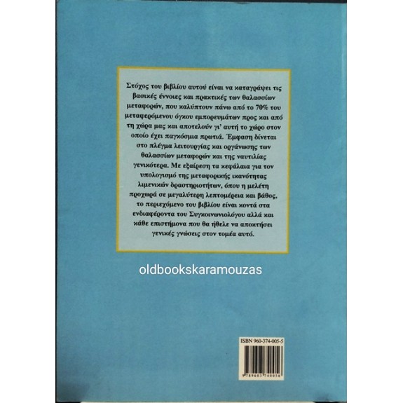 *Στόχος του βιβλίου αυτού είναι να καταγράψει τις βασικές έννοιες και πρακτικές των θαλασσίων μεταφορών, που καλύπτουν πάνω από το 70% του μεταφερόμενου όγκου εμπορευμάτων προς και από τη χώρα μας και αποτελούν γι’ αυτή το χώρο στον οποίο έχει παγκόσμια πρωτιά. Έμφαση δίνεται στο πλέγμα λειτουργίας και οργάνωσης των θαλασσίων μεταφορών και της ναυτιλίας γενικότερα. Με εξαίρεση τα κεφάλαια για τον υπολογισμό της μεταφορικής ικανότητας λιμενικών δραστηριοτήτων, όπου η μελέτη προχωρά σε μεγαλύτερη λεπτομέρεια και βάθος, το περιεχόμενο του βιβλίου είναι κοντά στα ενδιαφέροντα του Συγκοινωνιολόγου αλλά και κάθε επιστήμονα που θα ήθελε να αποκτήσει γενικές γνώσεις στον τομέα αυτό.